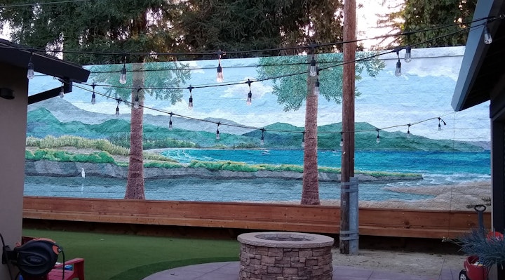 This is a sound wall, with a busy freeway on the other side. The mural serves to open up the space and give the sense of a calm vacation. The very rough cement block construction did not allow for much detail.