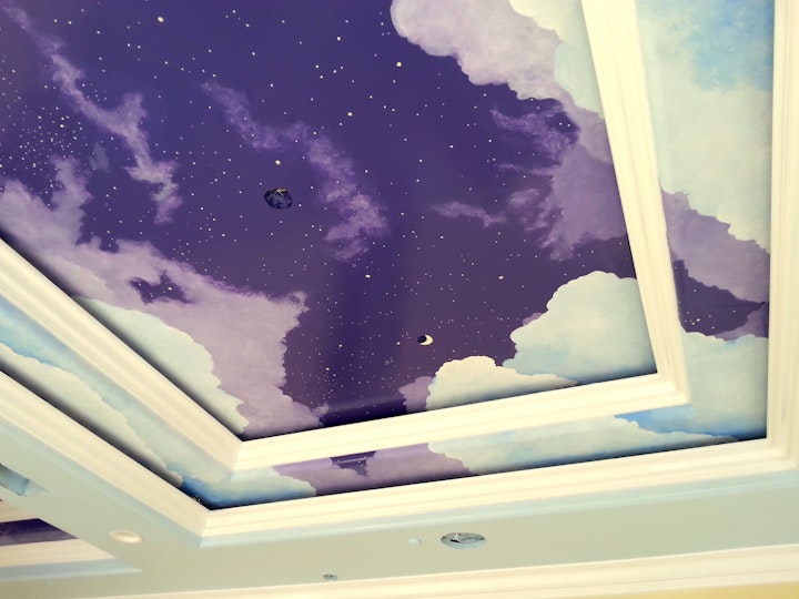 A storybook night sky. A ceiling fan was installed once the mural was finished.