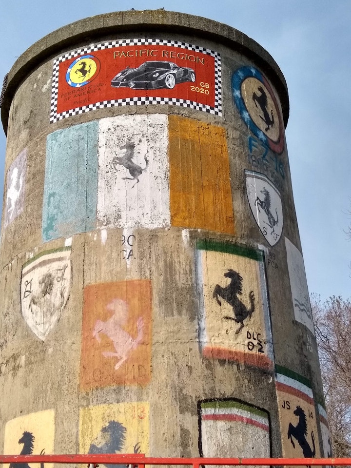 For many years (25? 35? not sure) the Ferrari Club of America, Pacific Region has held an annual rally from the SF bay area east through the winding Delta roads, ending up here at this disused water tower. The owners of the tower have generously allowed both this gathering on their land, and each club president to have a commemorative logo painted on this tower. In 2020 it was my turn. (No, I don't own a Ferrari).