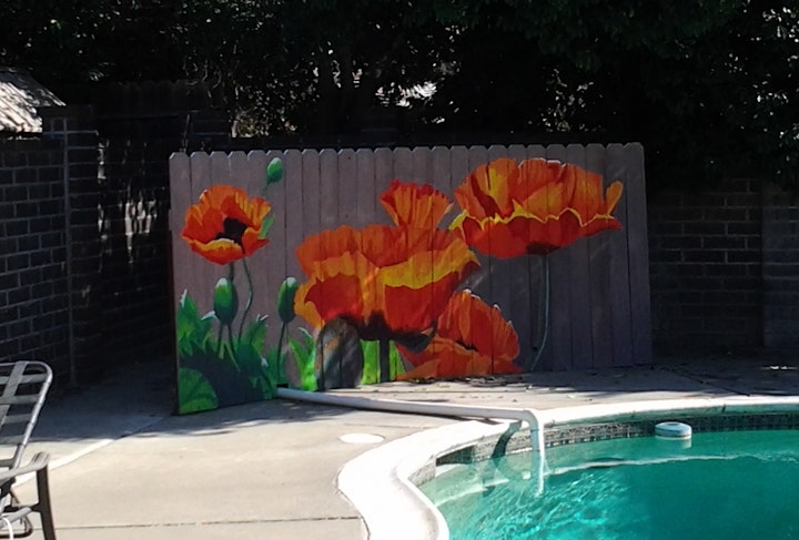 The first in a long line of poppy murals, decorating the wall that hides the pool mechanicals. These are Oriental poppies, though, not California poppies.